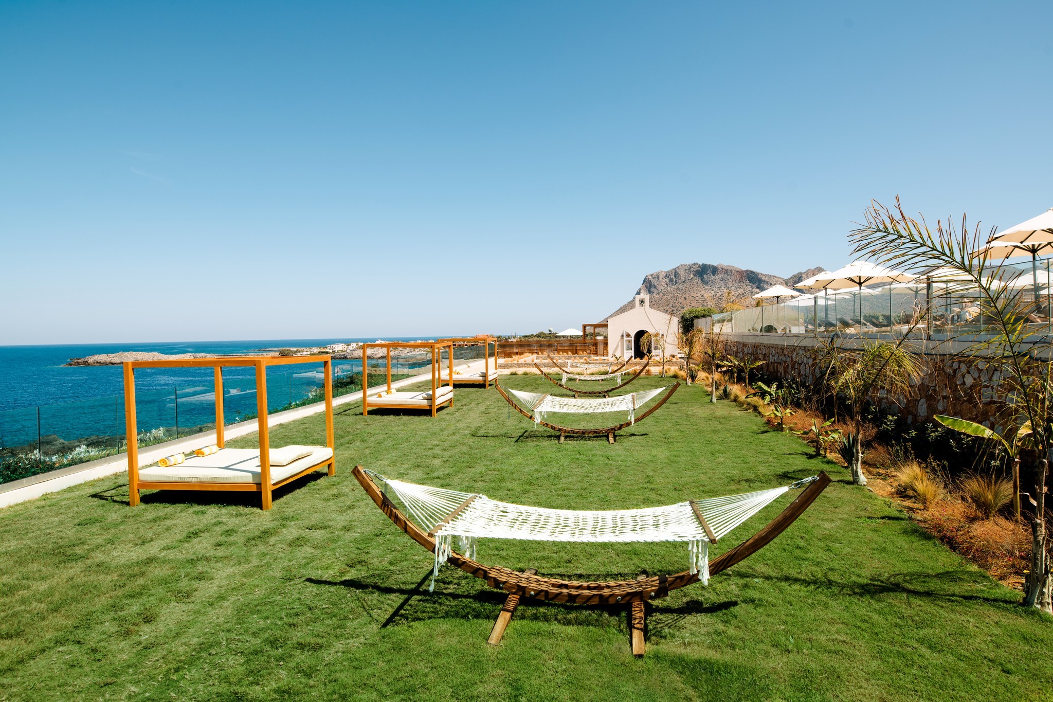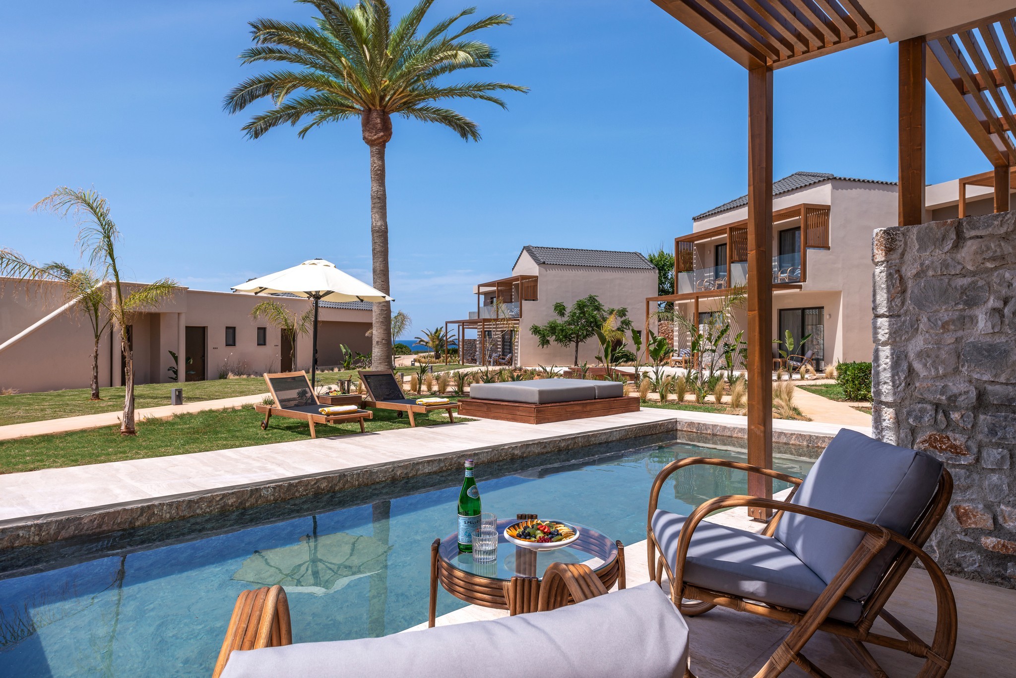 • Grande-suitek - egy nagy szoba, tágasabbak, a főépületben, a teraszról közvetlen kijárat a külön közös medencéhez, tengerre nézők